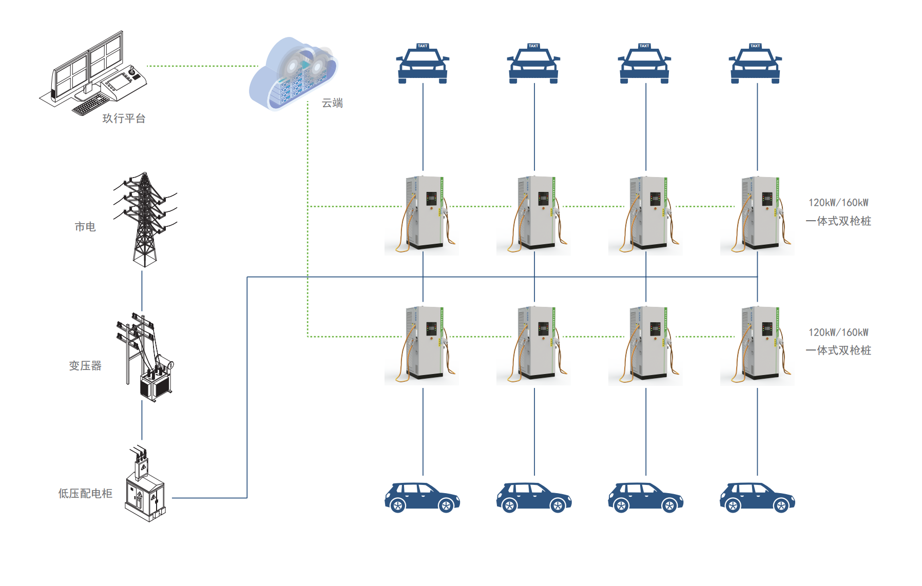 1)采用一体式直流充电桩,一个充电桩可满足给两辆车同时充电;