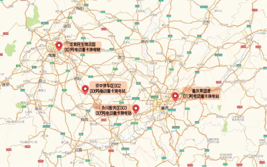 成渝电走廊换电重卡项目是全国首条高速公路重卡充换电走廊,分别在成都龙泉民生物流园、成渝高速资中停车区、成渝高速永川服务区和重庆果园港4处设置了6座充换电站,其中资中停车区、永川服务区分别设2座单通道换电站;民生物流园、果园港分别设1座单通道换电站。项目能有效解决新能源重卡中长途补能效率低、补能时间长、补能设施匮乏等难题,缓解续航焦虑。6座换电站经联动调试评估,换电设备可靠性、稳定性均达新能源重卡换电要求;单次换电时间仅需3-5分钟,自动换电成功率达99%,24小时内最高可完成换电168次,适配于吉利、东风、一汽、重汽王牌等大部分重卡车型。预计未来满跑后,全年耗电量3600万度,可减少碳排放1.512万吨,减少耗油量648万升,降低物流成本30%以上。