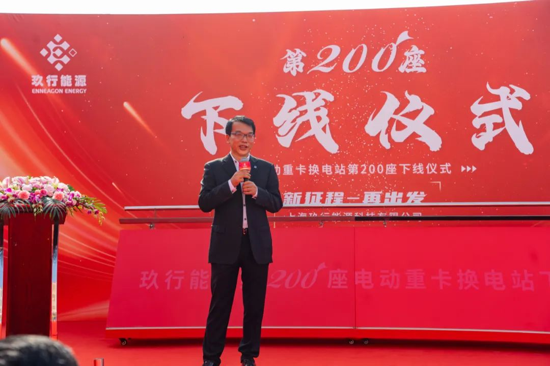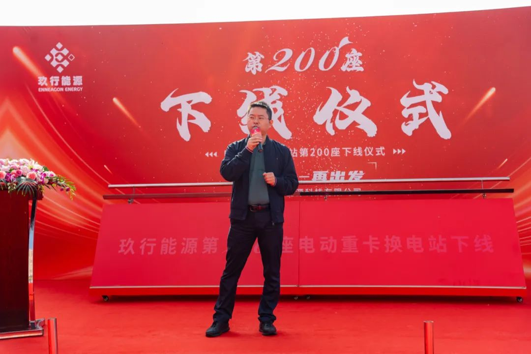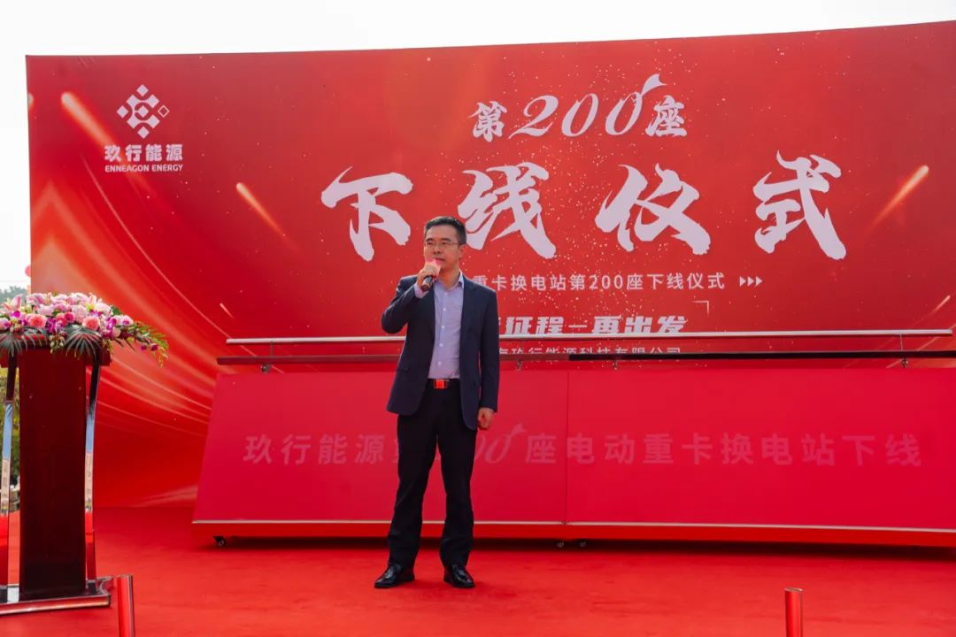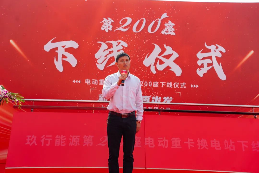 黄成节董事长代表重庆三峡绿动能源有限公司向玖行能源第200座换电站下线表示热烈祝贺,并表示玖行能源是三峡绿动重要合作伙伴,有着更紧密关系,有着更多的业务支持。